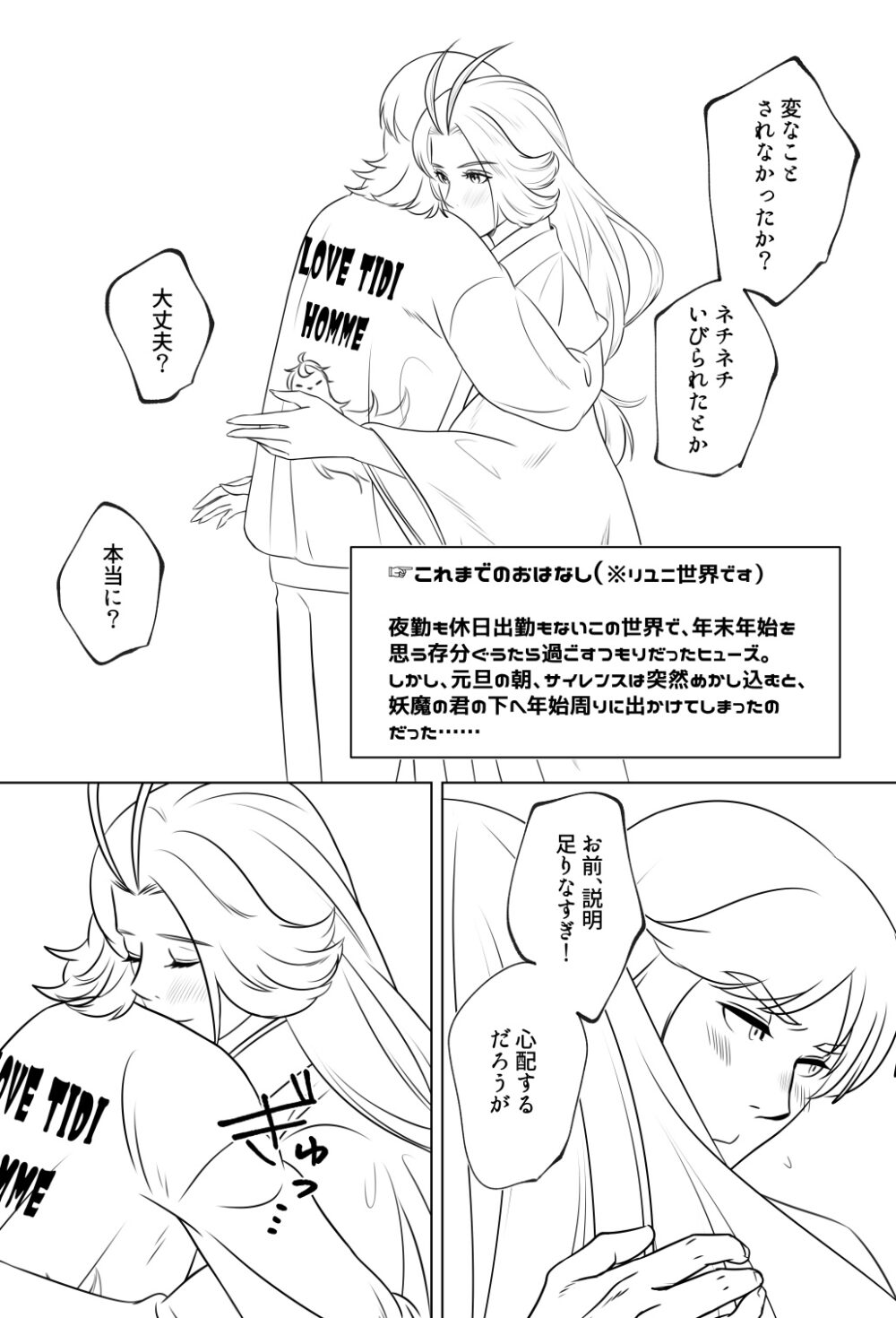 ヒューサイ漫画、ご参考までに1頁目を公開しておきます。お正月サイレンスのスタイルから妄想したもので、正月のお話です😹 春前になんとかするつもりだったのに、繁忙になって止まっちゃってたんです……。