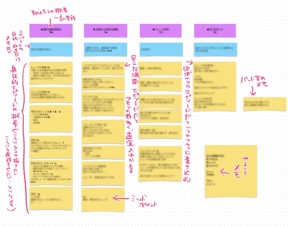 各パートの概要を簡潔にまとめておくことで、浮かんだけど合わないエピソードを別の場所に移したり、パートに合うよう考え直したりしやすくなります